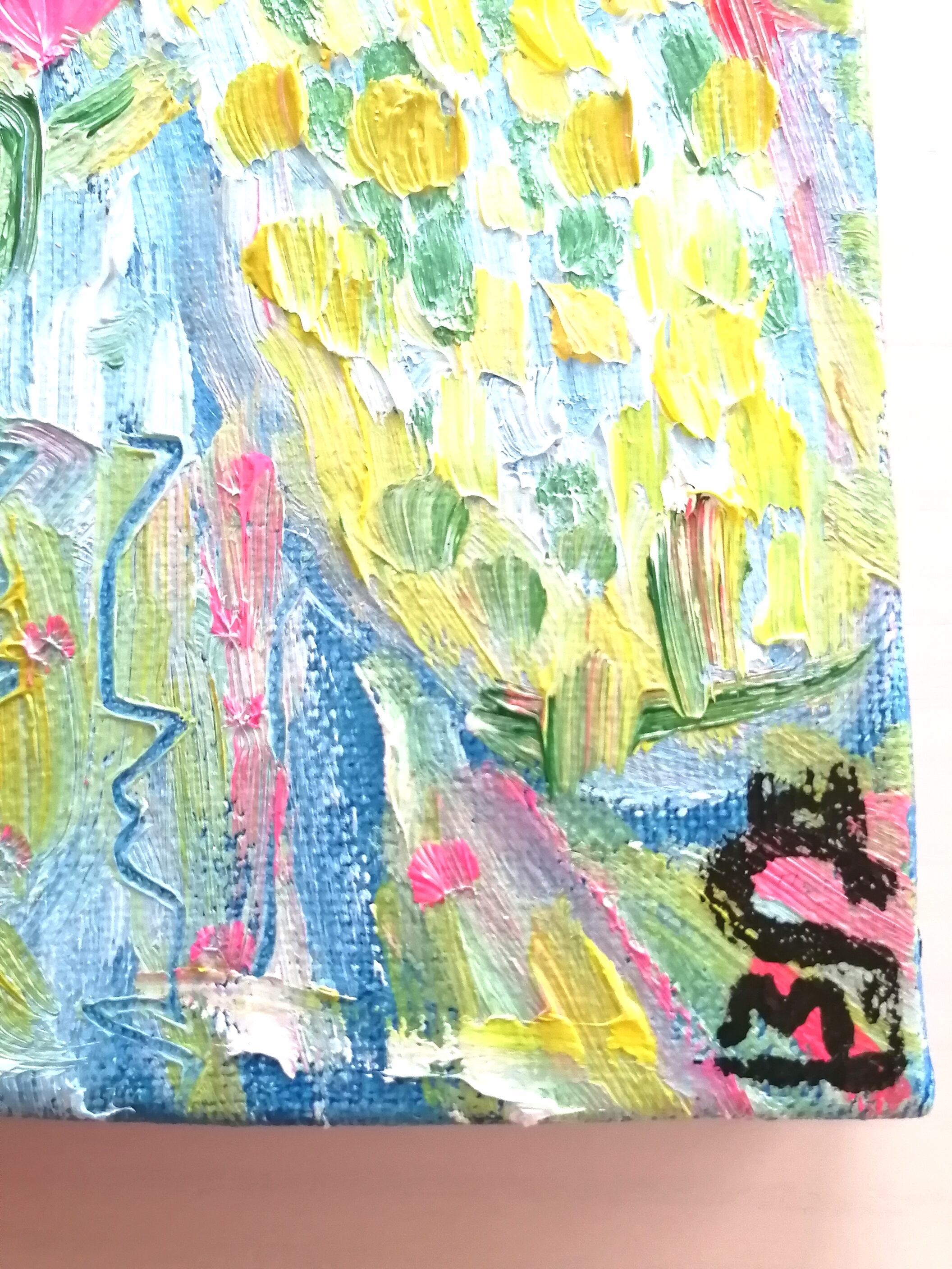 サイズはF0号(18㌢×14㌢)で小さく、額(額はつきません)をつけてもつけなくても楽しんでいただけますように、キャンバスの縁にも色を塗ってあります。油絵表面はワニスで保護しています。