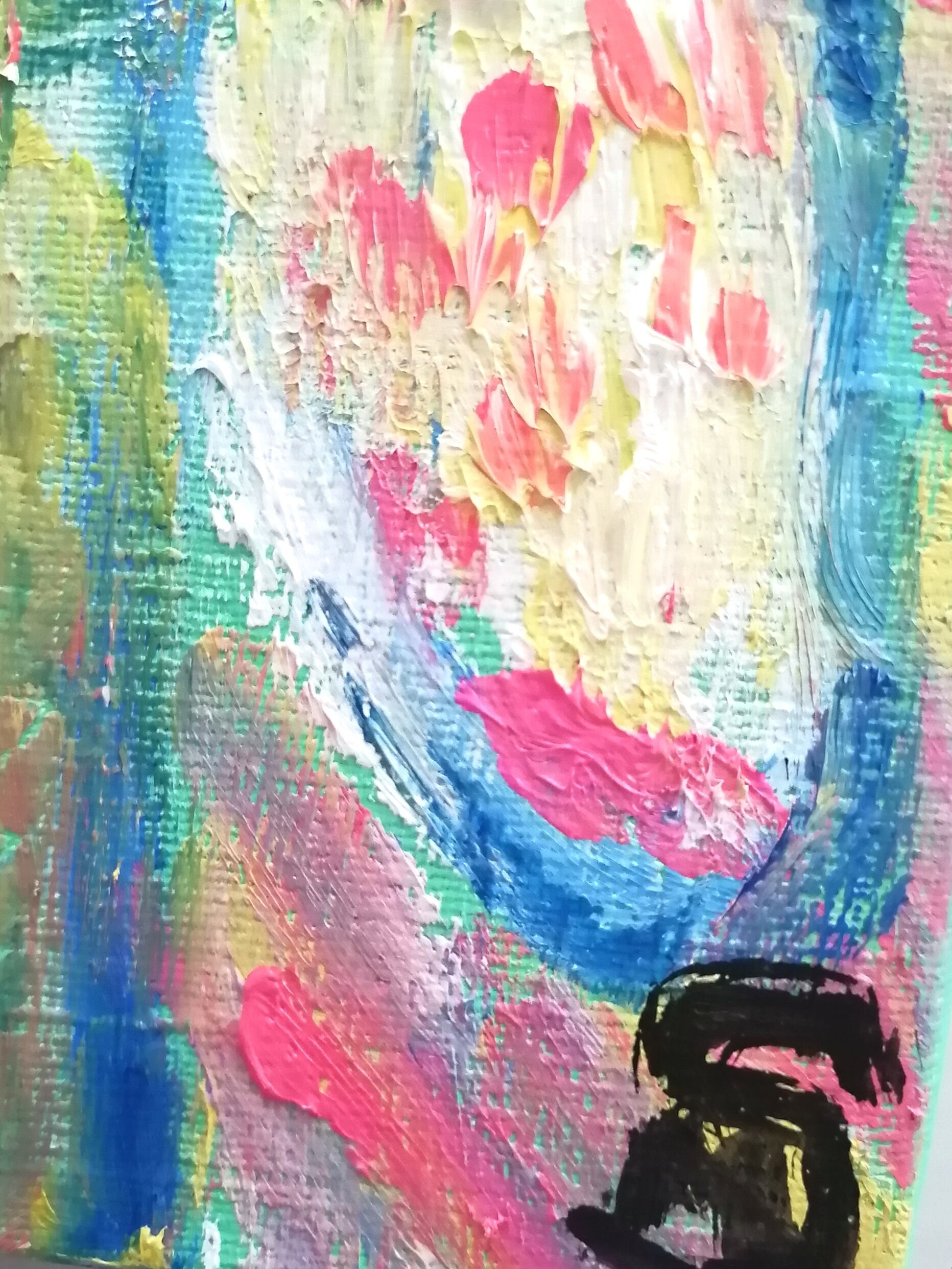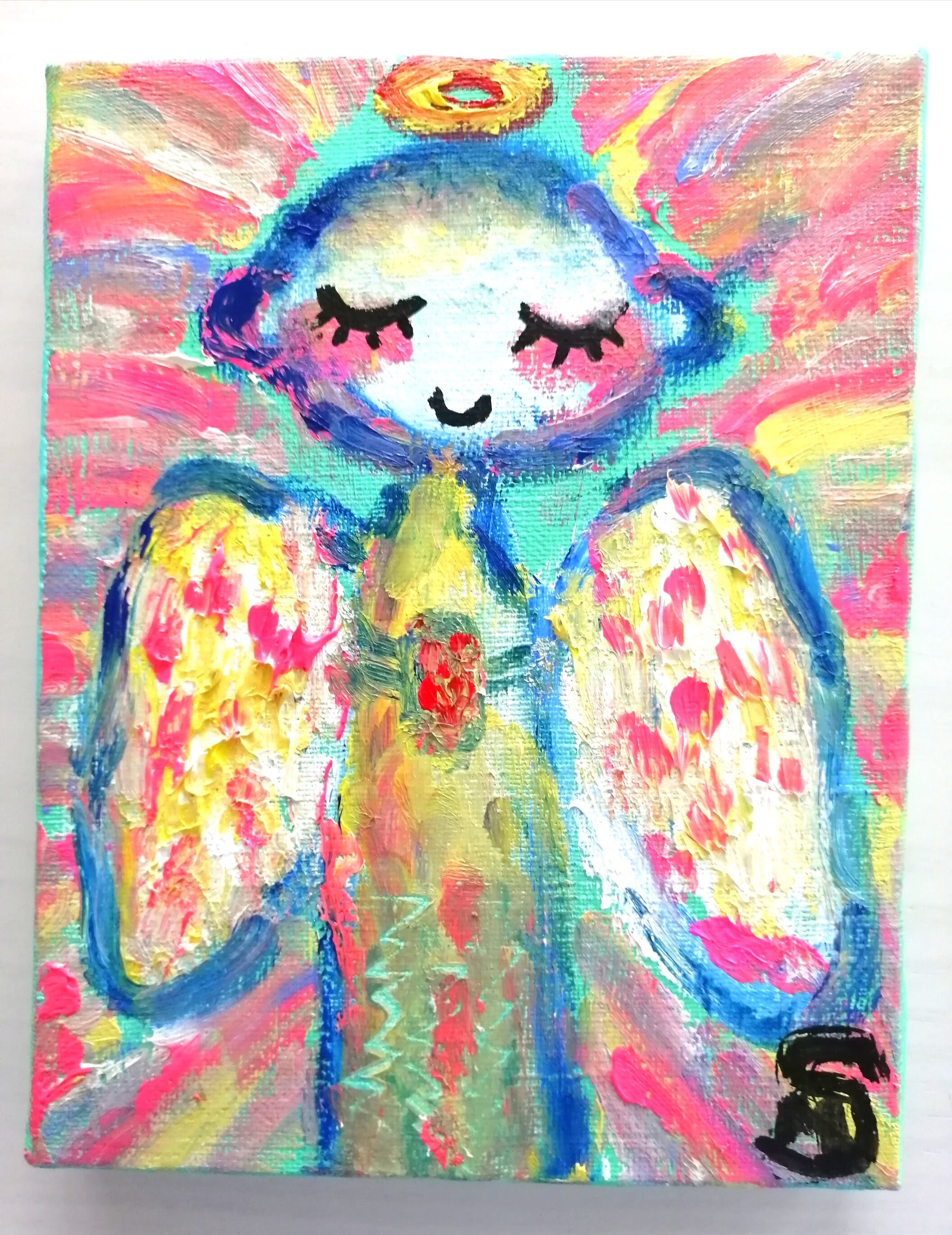 こちらの地蔵天使ちゃんは、とにかく可愛らしい1枚に仕上がりました。ピンク、黄色、ミントグリーンを中心にパステルカラーが甘く、優しさに溢れています。少し離れた目が癒やし系の地蔵天使ちゃんです。