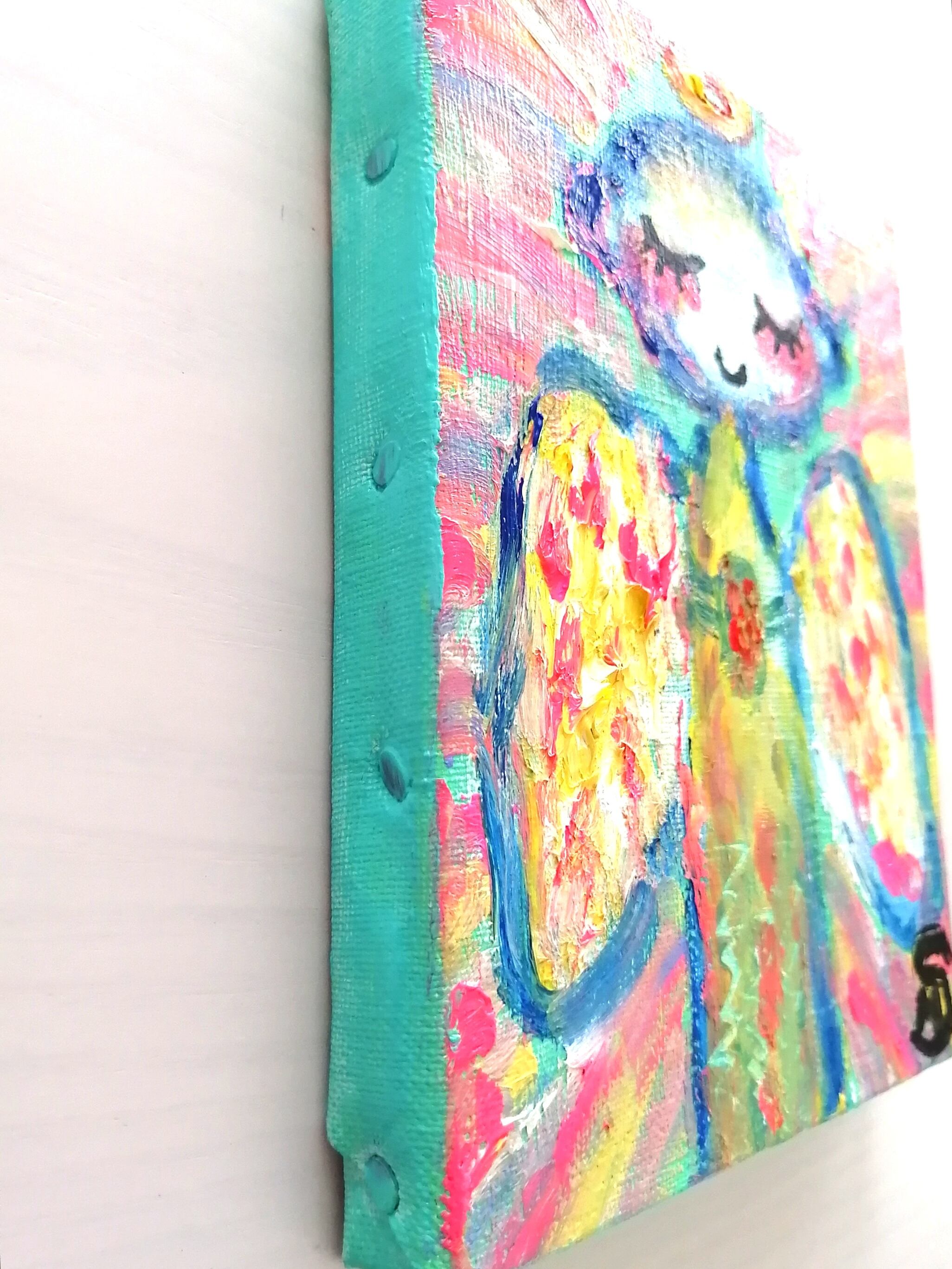 サイズはF0号(18㌢×14㌢)で小さく、額(額はつきません)をつけてもつけなくても楽しんでいただけますように、キャンバスの縁にも色を塗ってあります。油絵表面はワニスで保護しています。