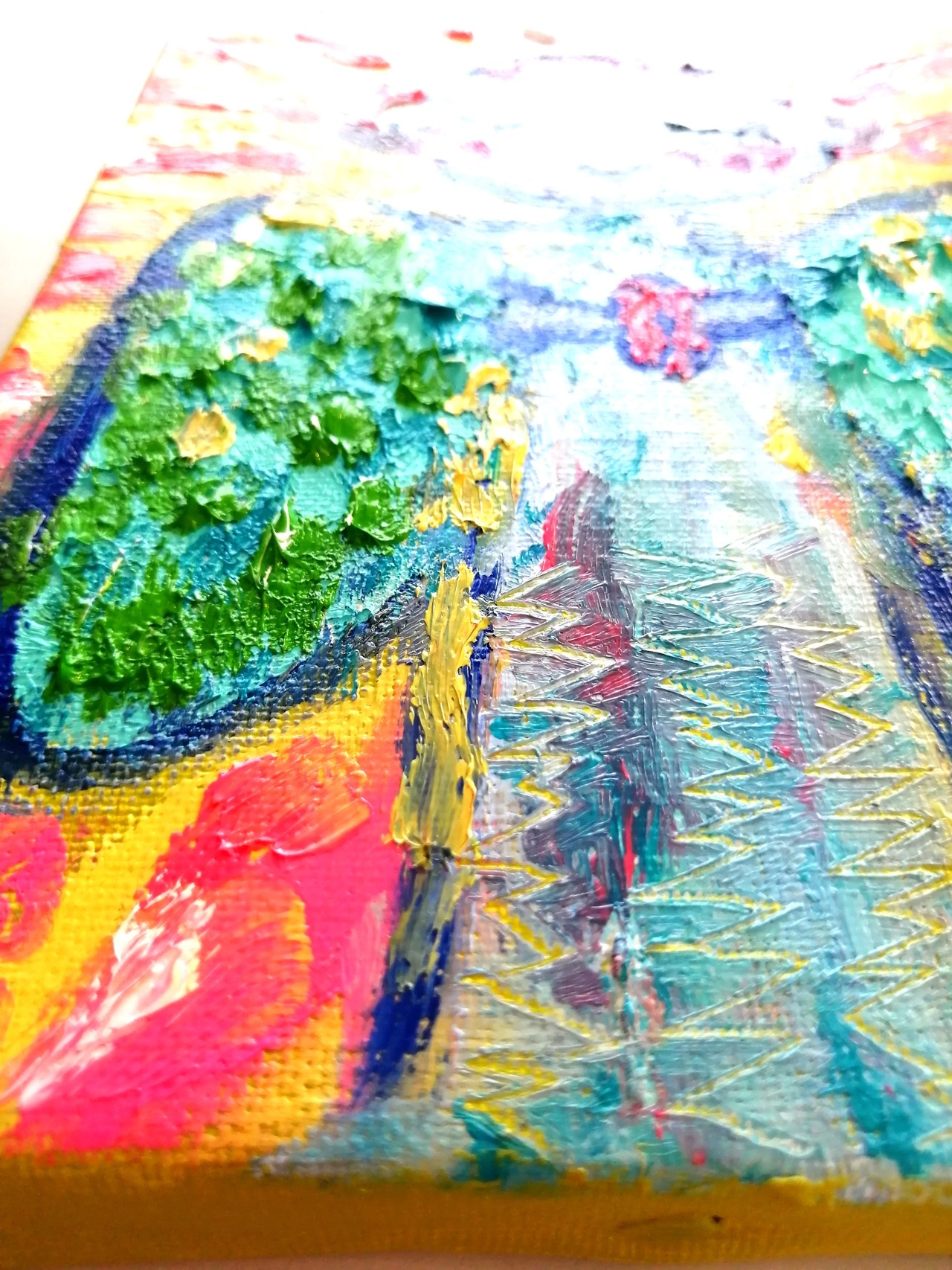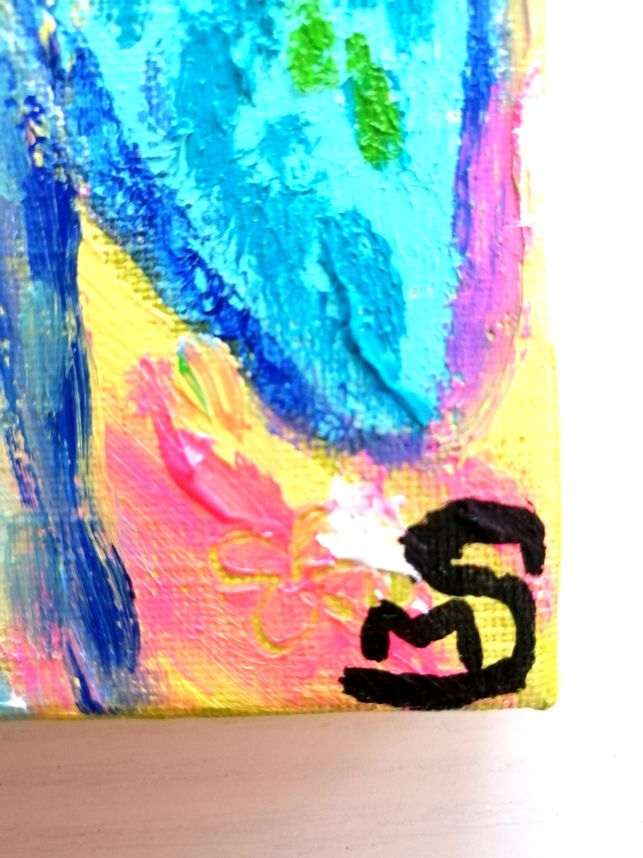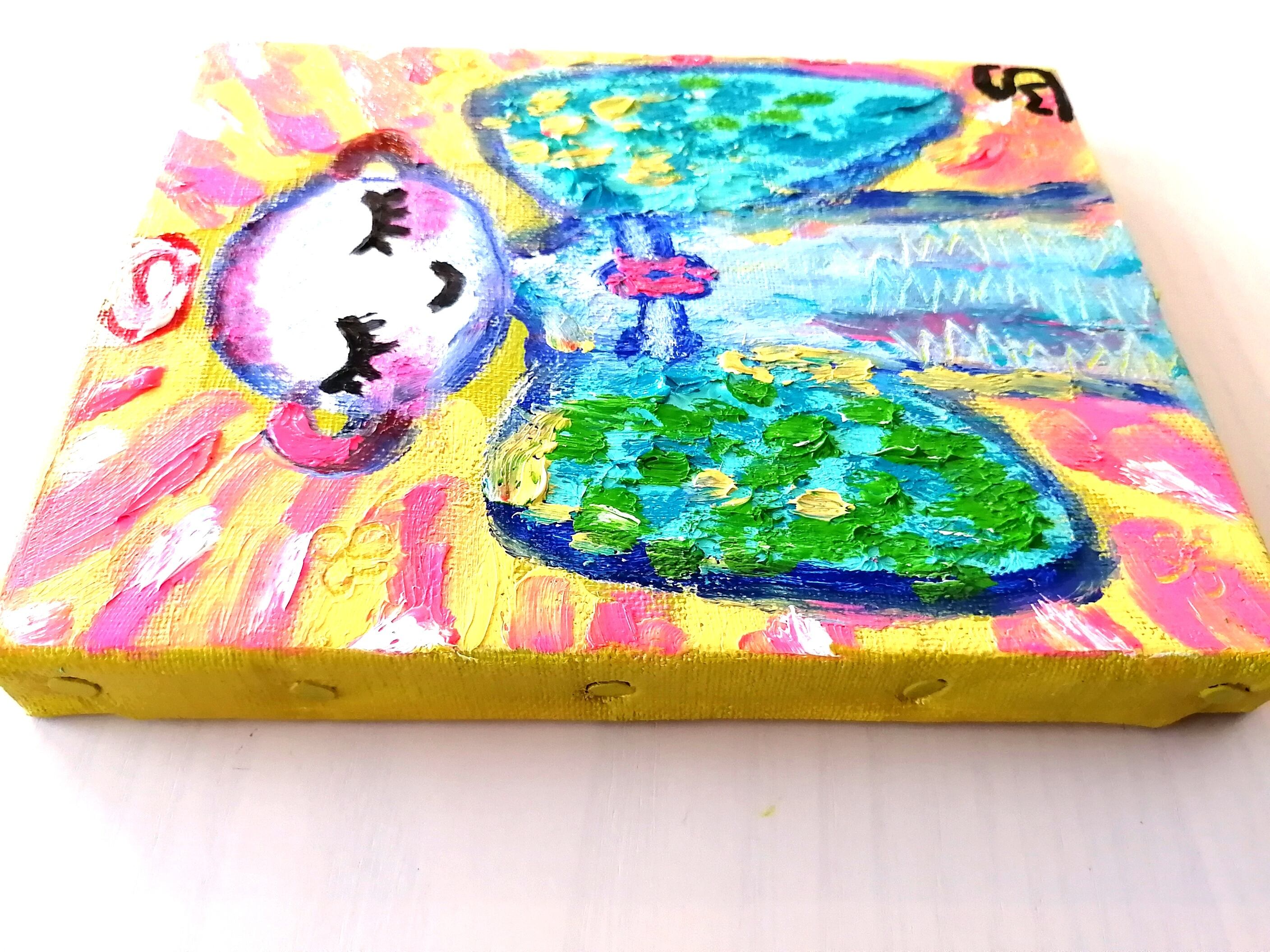 サイズはF0号(18㌢×14㌢)で小さく、額(額はつきません)をつけてもつけなくても楽しんでいただけますように、キャンバスの縁にも色を塗ってあります。油絵表面はワニスで保護しています。